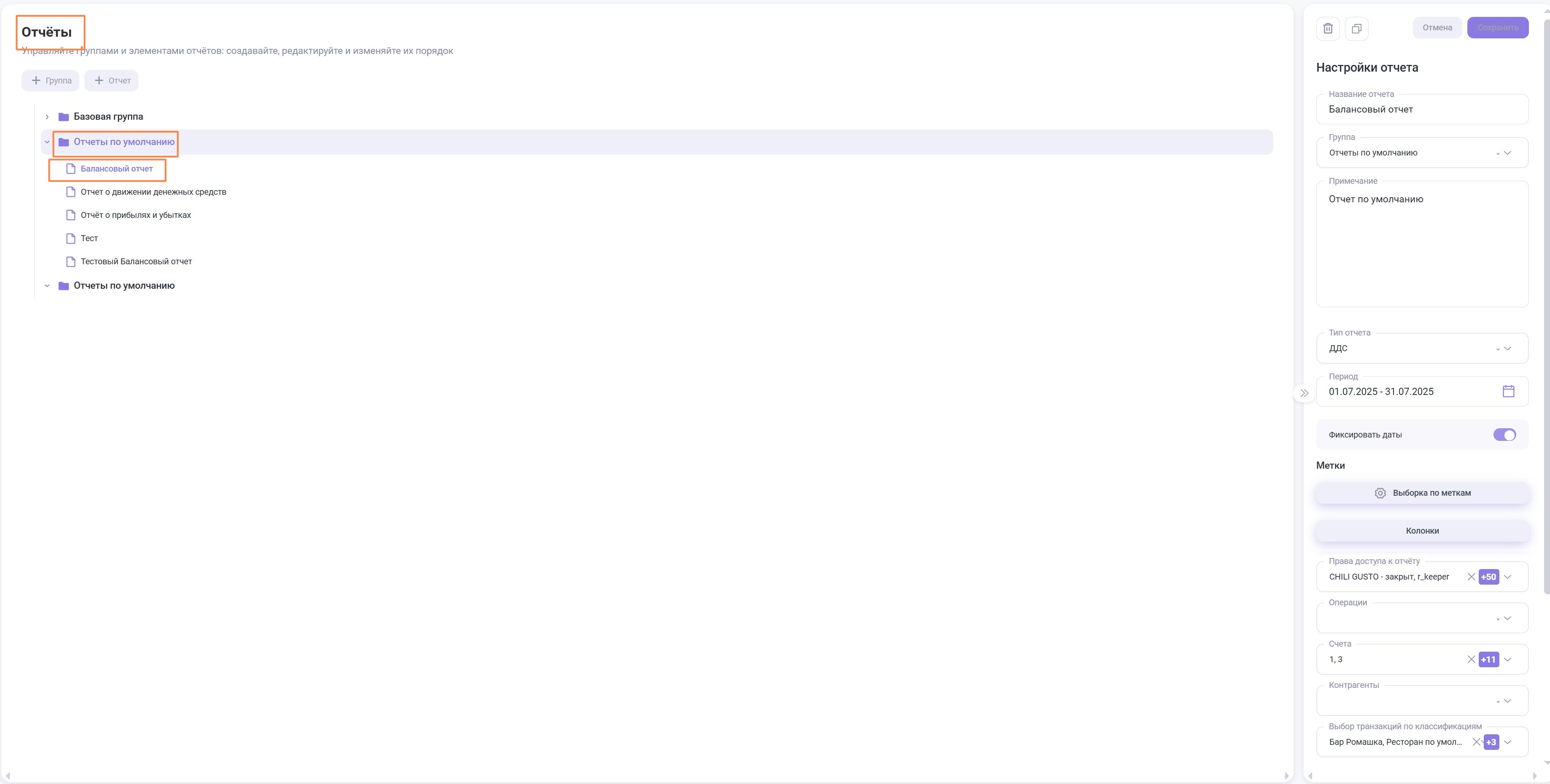 Отчеты по умолчанию включают в себя определенную выборку. Их нельзя удалить, редактировать (кроме прав доступа у группы) и сохранять (можно как новый отчет) или переместить в другую группу.