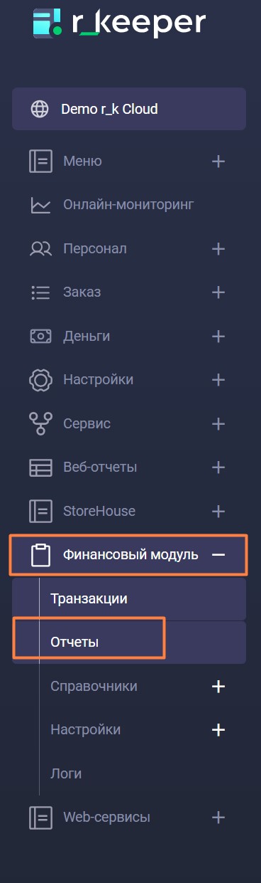 - На главной панели зайдите в раздел Финансовый модуль>Отчеты