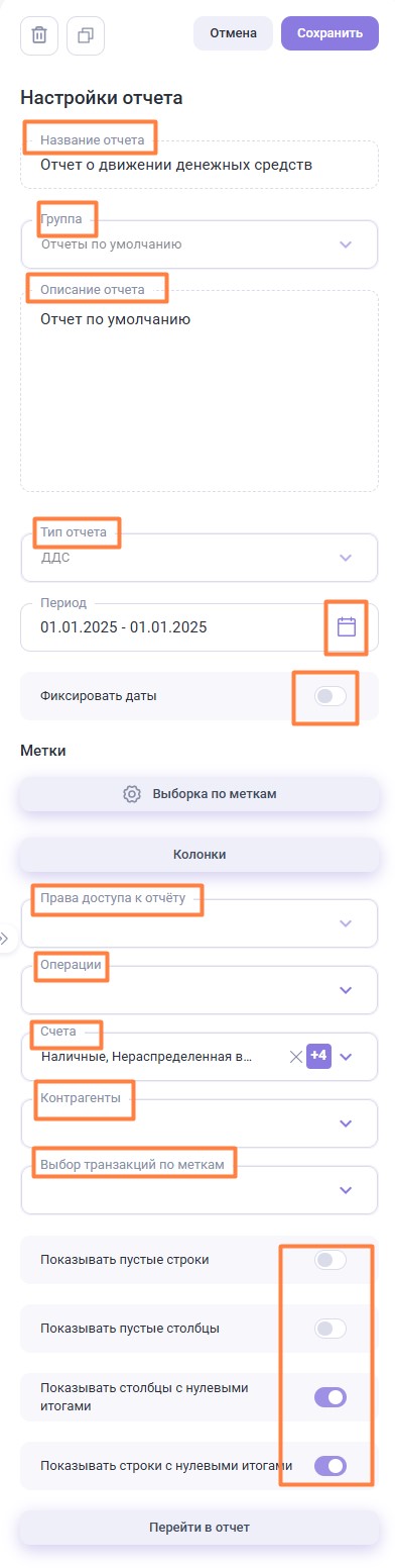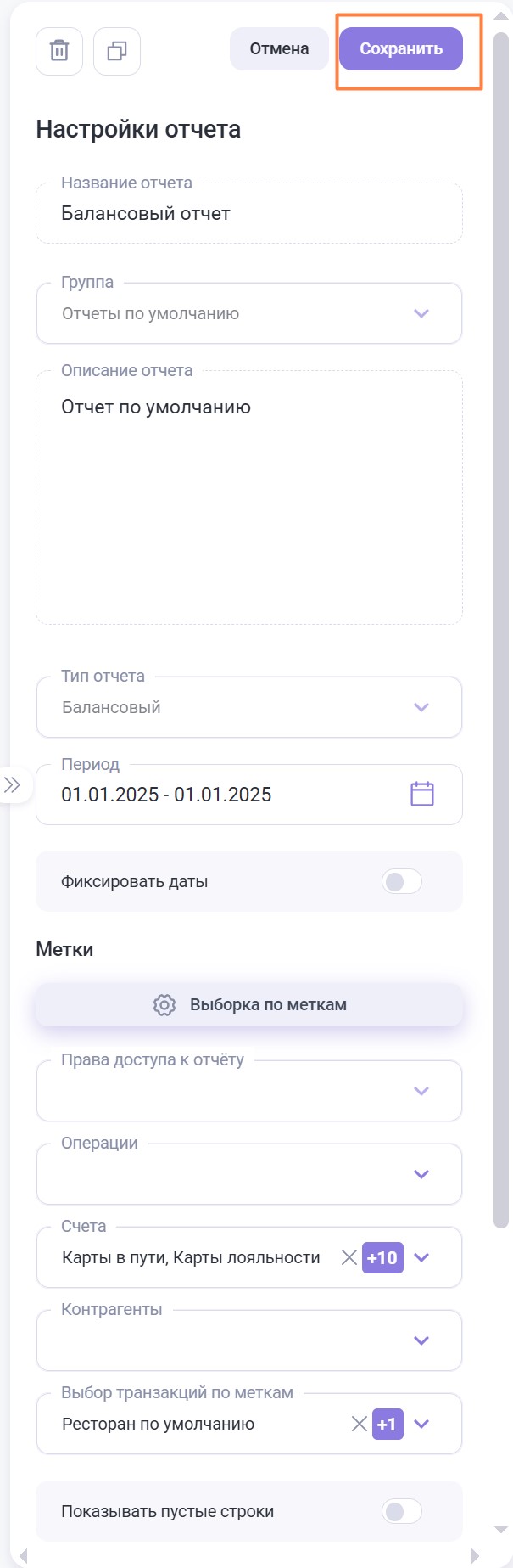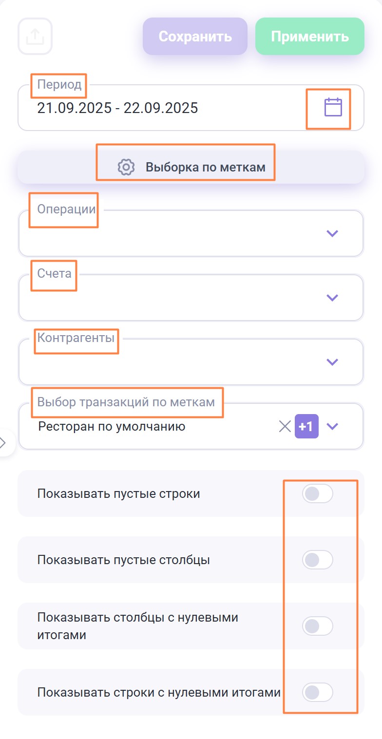 - Выбор транзакций по меткам — выберите метки из списка. При выборе в отчете происходит отбор по меткам, назначенным транзакциям. Необязательное поле.