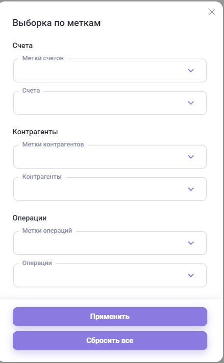 - Метки — при нажатии, открывается всплывающее окно с дополнительными фильтрами по меткам. Можно выбрать метки или группы меток следующих параметров: Счета, Контрагенты, Операции. ДЛя меток каждого параметра доступны кнопки: