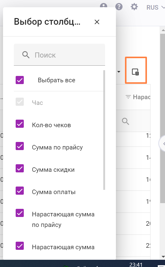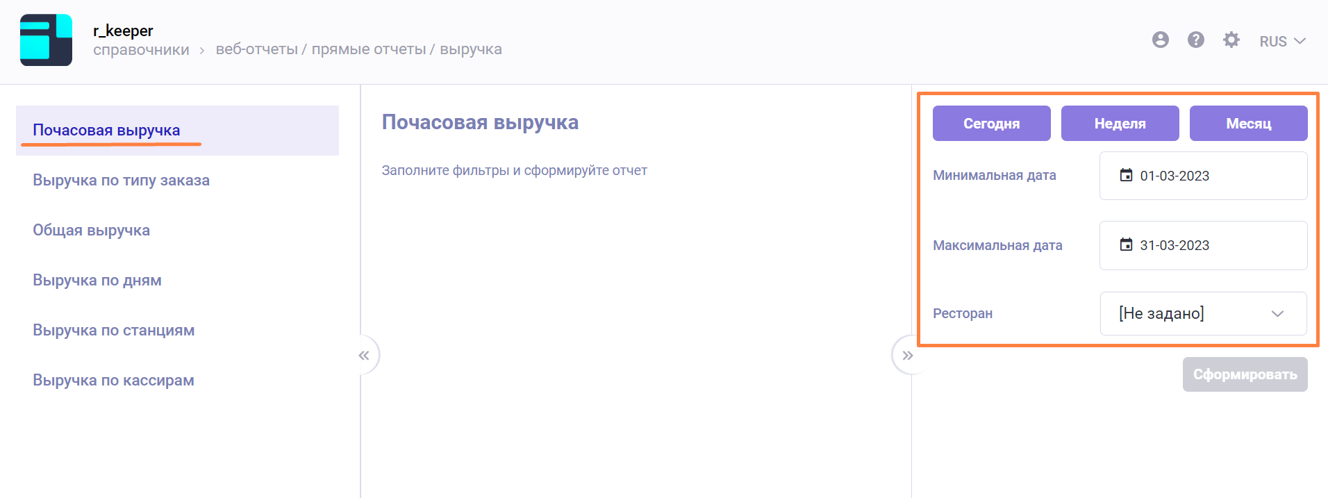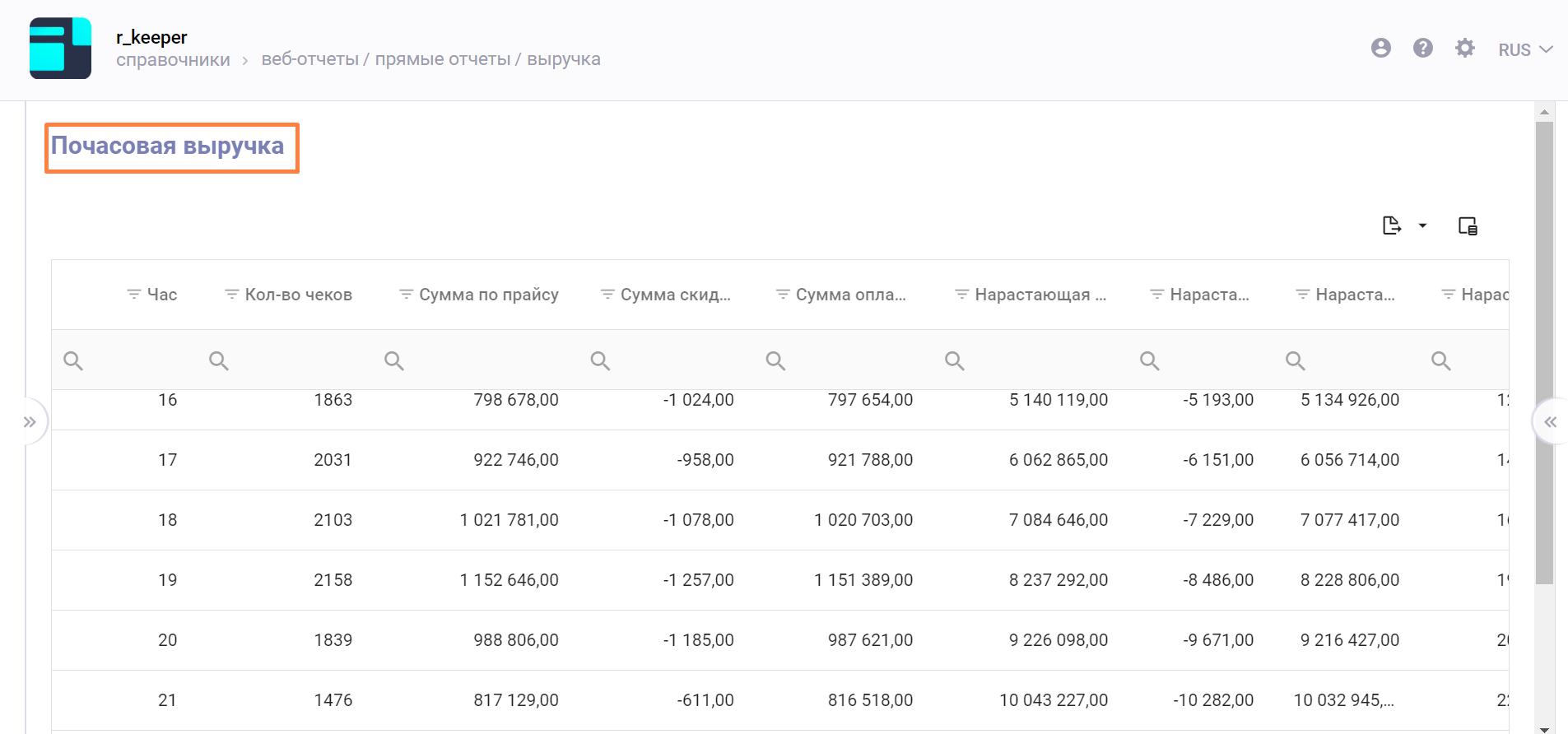 Web Manager Конструктор отчетов Веб-отчеты Прямые отчеты Выручка Current: Почасовая выручка Почасовая выручка Для построения отчета Почасовая выручка:Откройте Справочник Веб-отчетыОткройте раздел Прямые отчетыОткройте подраздел ВыручкаВыберите отчет Почасовая выручка, заполните даты и выберете ресторанСформируйте отчетПри необходимости можно настройте отображение столбцовПри необходимости можно экспортировать отчет в PDF или EXCELВоспользуйтесь кнопкой лупа для выбора конкретного действия со значением в столбце ×
