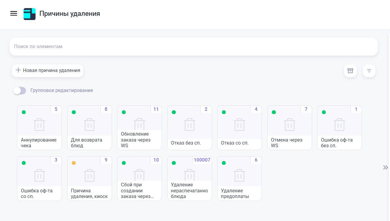 В справочнике Заказ > Причины удаления хранятся предустановленные причины удаления. При необходимости можно создавать новые.