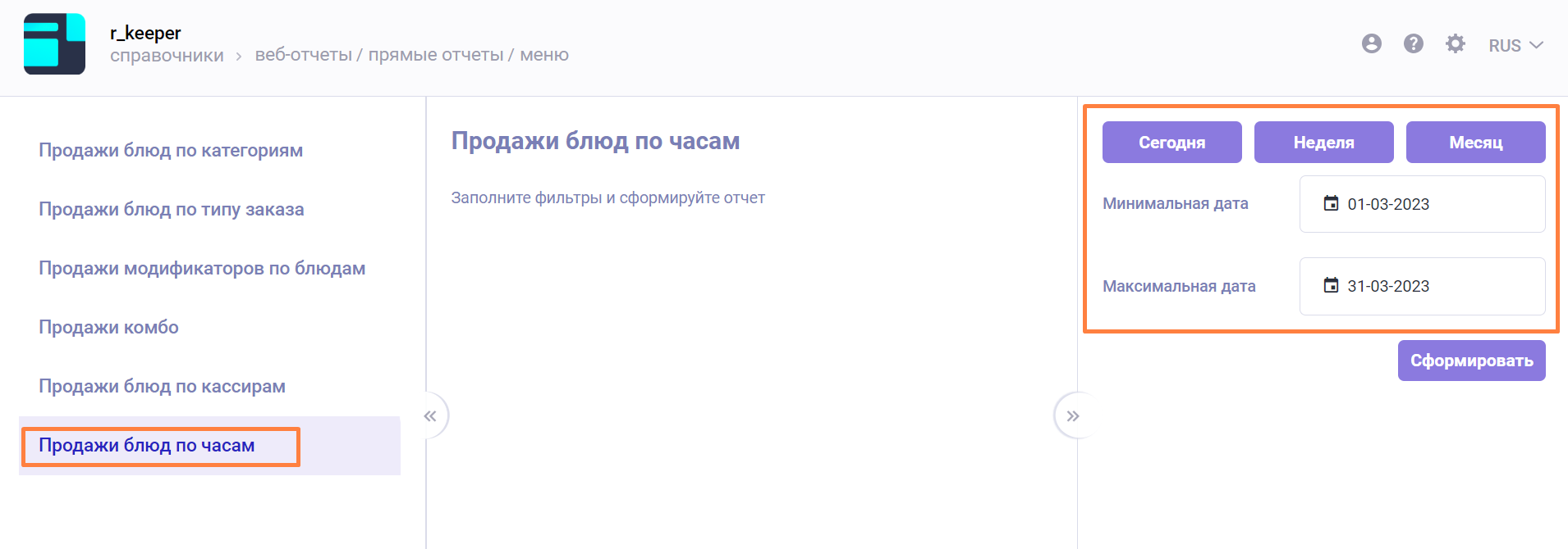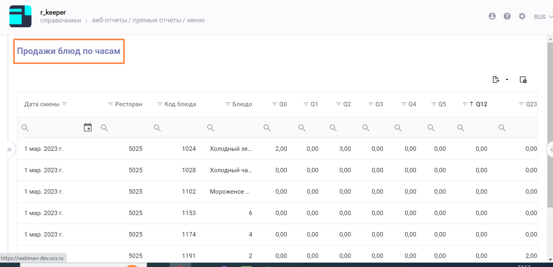 Web Manager Конструктор отчетов Веб-отчеты Прямые отчеты Меню Current: Продажи блюд по часам Продажи блюд по часам Для построения отчета Продажи блюд по часам:Откройте Справочник Веб-отчетыОткройте раздел Прямые отчетыОткройте подраздел МенюВыберите отчет Продажи блюд по часам и заполните датыСформируйте отчетВоспользуйтесь кнопкой лупа для выбора конкретного действия со значением в столбцеПри необходимости можно настройте отображение столбцовПри необходимости можно экспортировать отчет в PDF или EXCELПри нажатии на знак календаря можно выбрать данные за конкретный день ×