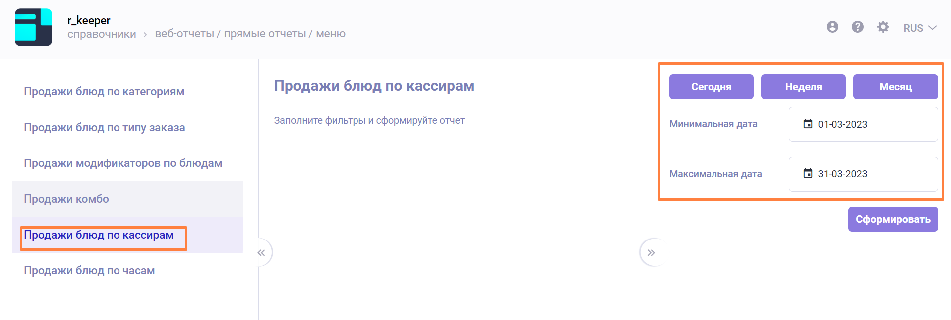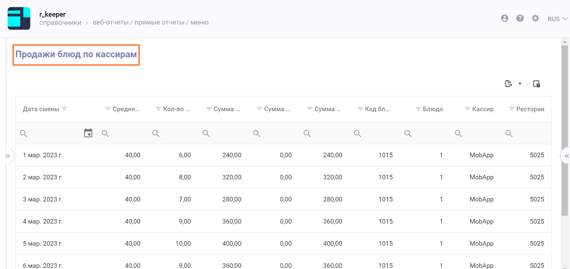 Web Manager Конструктор отчетов Веб-отчеты Прямые отчеты Меню Current: Продажи блюд по кассирам Продажи блюд по кассирам Для построения отчета Продажи блюд по кассирам:Откройте Справочник Веб-отчетыОткройте раздел Прямые отчетыОткройте подраздел МенюВыберите отчет Продажи блюд по кассирам и заполните датыСформируйте отчетВоспользуйтесь кнопкой лупа для выбора конкретного действия со значением в столбцеПри необходимости можно настройте отображение столбцовПри необходимости можно экспортировать отчет в PDF или EXCELПри нажатии на знак календаря можно выбрать данные за конкретный день ×