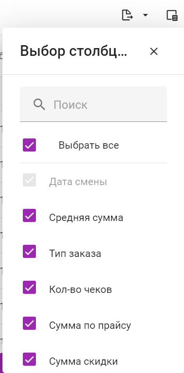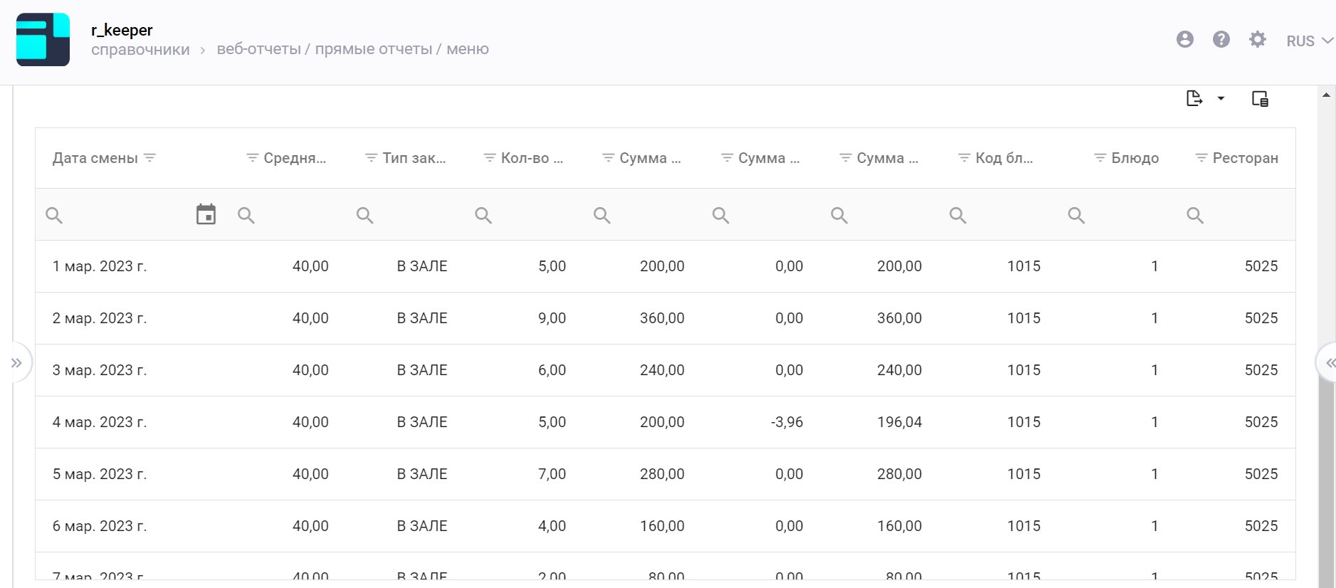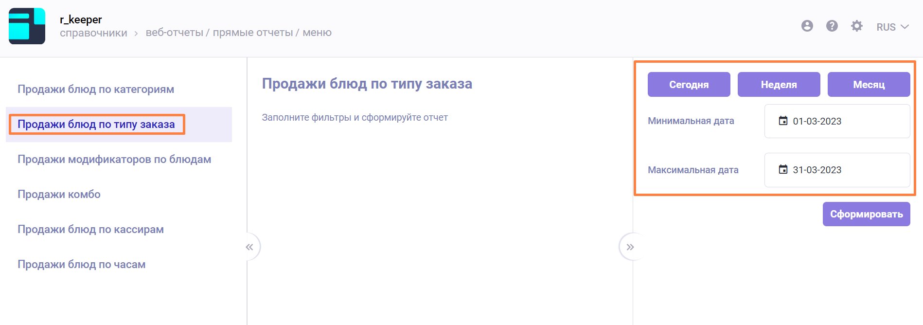 Web Manager Конструктор отчетов Веб-отчеты Прямые отчеты Меню Current: Продажи блюд по типу заказа Продажи блюд по типу заказа Для построения отчета Продажи блюд по типу заказа:Откройте Справочник Веб-отчетыОткройте раздел Прямые отчетыОткройте подраздел МенюВыберите отчет Продажи блюд по типу заказа и заполните датыСформируйте отчетВоспользуйтесь кнопкой лупа для выбора конкретного действия со значением в столбцеПри необходимости можно настройте отображение столбцовПри необходимости можно экспортировать отчет в PDF или EXCELПри нажатии на знак календаря можно выбрать данные за конкретный день ×