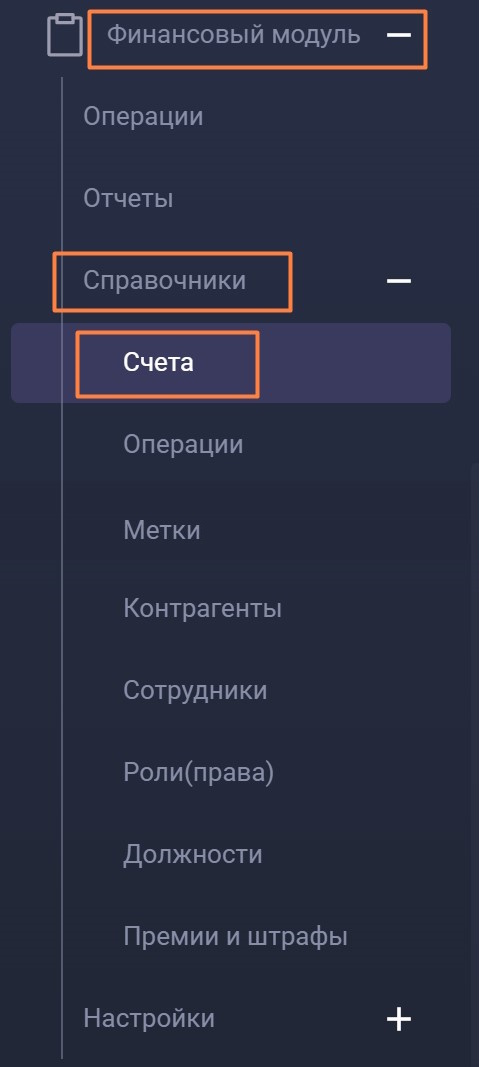- Зайдите а раздел меню Финансовый модуль>Справочники>Счета