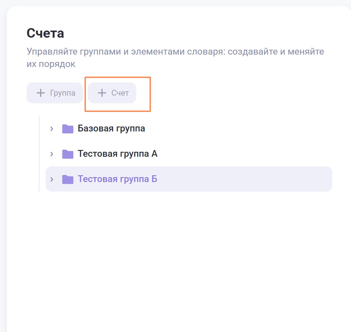 - Группа — выберите группу из списка. Группа — совокупность элементов иерархической структуры, которая содержит элементы, относящиеся к определенному виду данных, например счета или операции.