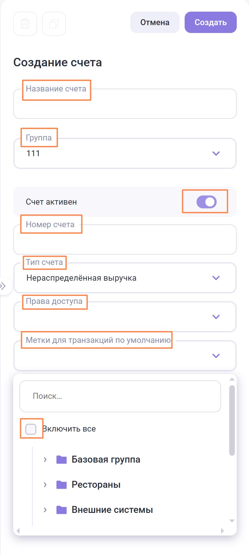 - Метки для транзакций по умолчанию — выберите метки из списка, которые будут автоматически подставляться в таблице транзакций при выборе данного счета. Для выбора всех меток, нажмите кнопку Включить все.