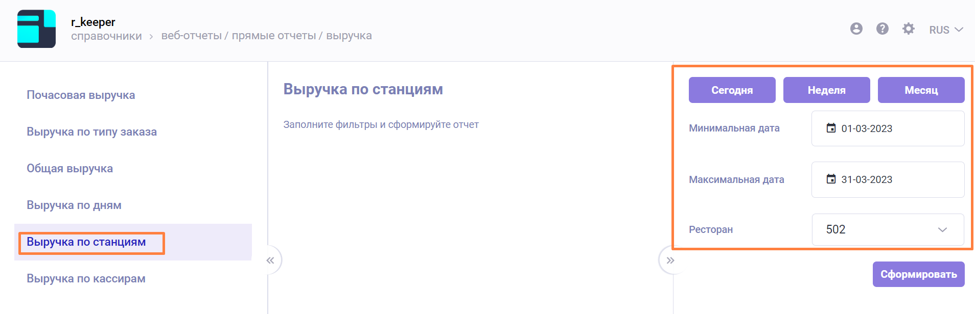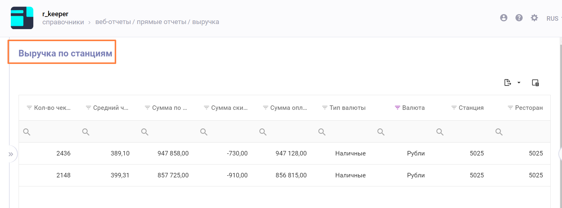 Web Manager Конструктор отчетов Веб-отчеты Прямые отчеты Выручка Current: Выручка по станциям Выручка по станциям Для построения отчета Выручка по станциям:Откройте Справочник Веб-отчетыОткройте раздел Прямые отчетыОткройте подраздел ВыручкаВыберите отчет Выручка по станциям, заполните даты и выберете ресторанСформируйте отчетПри необходимости можно настройте отображение столбцовПри необходимости можно экспортировать отчет в PDF или EXCELВоспользуйтесь кнопкой лупа для выбора конкретного действия со значением в столбце ×